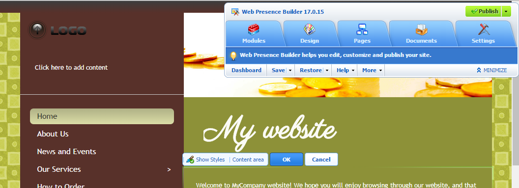 In Presence Builder kunt u vrijwel alle elementen van uw website aanpassen. De meeste elementen worden direct in de site zelf gewijzigd - u opent de pagina waar het element wordt gebruikt, u bewerkt deze en ziet het resultaat direct verschijnen. Elementen voor de site als geheel, zodat de elementen die zijn toegevoegd aan de delen van de site gemarkeerd met DESIGN worden aangepast op één plek, maar de wijzigingen worden doorgevoerd voor alle pagina's van uw website.