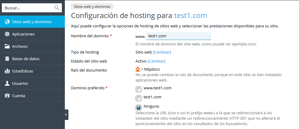 - Dominio preferido. Se muestra para los dominios cuyo tipo de hosting es Sitio web. Consulte Hosting de sitios web.