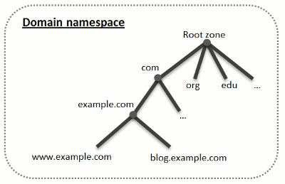 DNS 基於稱為網域命名空間的樹形等級結構。此全網域命名空間包含所有可能的域名並分為各個邏輯部分 - 域名空間(查看下圖)。域名區域是包含某些域名位址的命名空間的一部分。位址保存在授權於該區域的獨立域名伺服器上的檔裡。比如,當一個瀏覽器嘗試存取 www.example.com 時,會獲取授權於該 example.com 區域的伺服器上的網站 IP 地址。欲瞭解更多有關 DNS 如何工作的資訊,可參閱相應的文檔。您可以在互聯網上的很多資源中找到,例如,Microsoft TechNet。