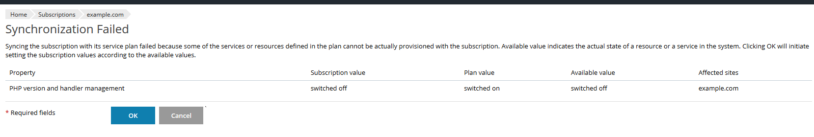 This means that the sync procedure failed for one or more domains assigned to the subscription. The most likely cause is the fact that the hosting plan on which the subscription is based includes resources or permissions that are unavailable to you. In the example above, the sync procedure failed because the PHP version and handler management permission, which is included in the hosting plan (note the Plan value column), is not, in fact, available (note the Available value column).