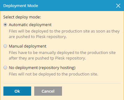 By default, Plesk uses the Automatic deployment mode. This means that after a file is pushed to the repository, it is immediately deployed to the target directory (you can switch off this mode if necessary, see the Select Deploy Mode section).