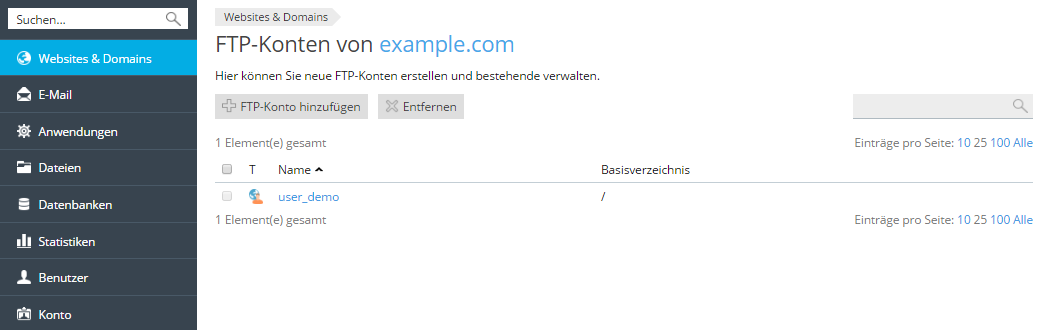 2. Aktivieren Sie das Kontrollkästchen für das zu entfernende FTP-Konto und klicken Sie auf Entfernen. Beachten Sie allerdings, dass das Haupt-FTP-Konto eines Abonnements nicht entfernt werden kann.