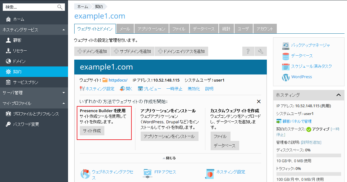 Presence Builder でウェブサイトを作成することを選んだ場合は、ホスティング契約にこのオプションが含まれていることを確認してください。含まれていない場合は、別の方法でウェブサイトを作成するか、契約をアップグレードしてください。