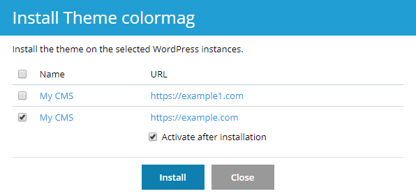 - Seleccione las instancias de WordPress donde desea instalar el tema cargado.