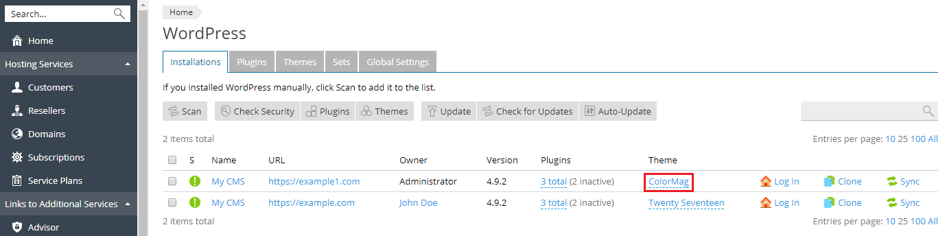 Todas las instalaciones de WordPress añadidas a través del paquete de herramientas de WordPress o de la página Aplicaciones aparecen de forma automática en el paquete de herramientas de WordPress; aquellas que se hubieran instalado de forma manual deberán agregarse al paquete de herramientas de WordPress. Si actualizó una versión anterior de Plesk y utilizaba WordPress, le recomendamos añadir todas las instalaciones existentes de WordPress al paquete de herramientas de WordPress. Para añadir instalaciones de WordPress al paquete de herramientas de WordPress, vaya a Sitios web y dominios > WordPress y haga clic en Analizar. Tenga en cuenta que si instala copias nuevas de WordPress de forma manual una vez finalizada la detección, dichas instalaciones no se añadirán al paquete de herramientas de WordPress.