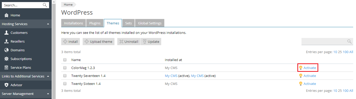 - Debajo de "Temas", haga clic en el nombre del tema correspondiente a una instancia para la que desea activar otro tema. En el ejemplo que puede ver a continuación, hace clic en el tema ColorMag, que en este momento está activo.