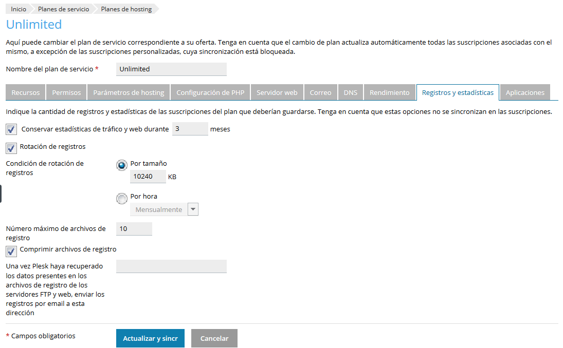 Nota: la opción Conservar estadísticas de tráfico y web no se modifica en las suscripciones cuando usted la actualiza para un plan de servicio. La única forma de actualizar esta opción para cada dominio es modificarla en la base de datos de Plesk. Para más información, consulte este artículo de nuestra base de conocimiento.